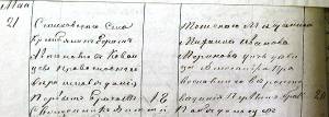 ![]() ![]() Отец Белозерских Степана Осиповича. ![]() ![]() Крестьянин, жил в селе Семёновка Зырянского района, Томской области. В метрических книгах его имя – АВТОНОМ. Ж ена – Кованцева Дарья Исаевна. Их дети: Ефим (1861 – 1931), Кондрат (1874 -…), Апросинья (Анна) (1887), Илья (1888 - …), Федора, Фёкла.К сожалению, метрической книги за 1861 год, год рождения Ефима Артамоновича, не сохранилось ни в одном из архивов, Ефим был старшим из детей. В метрической книге Никольской церкви за 1874 год есть запись о рождении младшего брата Кованцева Ефима Артамоновича – Кованцева Кондрата Артамоновича и сведения о родителях Кованцева Ефима Артамоновича. В графе «Звание, имя, отчество и фамилии родителей и какого вероисповедания» есть запись: «Зырянской волости Семёновскаго села крестьянин Артамонъ Васильевъ Кованцевъ и законная его жена Дарья Исаева, оба православного вероисповеданiя» (Ф. 86, Оп. 1, Д. 134, Л. 5 - 6). ![]() ![]() Крестьянка, жила в селе Семёновка Зырянского района, Томской области. Муж – Кованцев Артамон (Автоном) Васильевич. В семье родились дети: Ефим, Кондрат, Апросинья (Анна), Илья, Федора, Фёкла. ![]() Меринов Михаил Иванович - томский мещанин, позднее, возможно, крестьянин. Жил в селе Семёновка Зырянского района Томской области. Дети: Тимофей, Иван, Александра, Григорий. В селе Семёновка жил и брат Михаила Ивановича – томский мещанин Меринов Филипп Иванович. Его жена – сестра Кованцева Ефима Артамоновича – Меринова (Кованцева) Фёкла Артамоновна. Меринов Филипп Иванович был поручителем по жениху на венчании Тита Ефимовича Кованцева и Кованцевой (Ильиных) Пелагеи Никитичны. Меринов Филипп Иванович был дядей Кованцевой (Мериновой) Александры Михайловны, матери Тита Ефимовича, ![]() ![]() Отец Ильиных Никиты Феклистовича. Возможно, житель Пермской губернии. ![]() ![]() Отец Ильиных Александры Васильевны. Возможно, житель Пермской губернии. Иванович был дядей Кованцевой (Мериновой) Александры Михайловны, матери Тита Ефимовича. ![]() ![]() Кованцев Василий, крестьянин, жил в селе Семёновка. Дети: Артамон, Иван, Алексей – все жили в селе Семёновка. ![]() ![]() Исай – отец Дарьи Исаевны, жены Кованцева Артамона Васильевича. ![]() ![]() Меринов Иван – отец Меринова Михаила Ивановича.