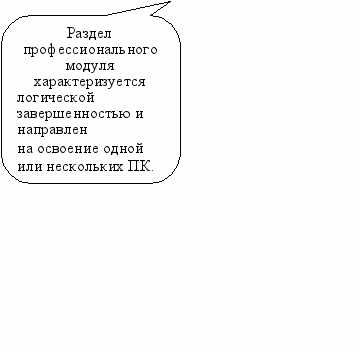 * Раздел профессионального модуля – часть примерной программы профессионального модуля, которая характеризуется логической завершенностью и направлена на освоение одной или нескольких профессиональных компетенций. Раздел профессионального модуля может состоять из междисциплинарного курса или его части и соответствующих частей учебной и производственной практик. Наименование раздела профессионального модуля должно начинаться с отглагольного существительного и отражать совокупность осваиваемых компетенций, умений и знаний.