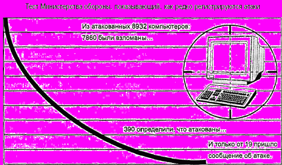 Легко видеть, что даже если у вас нет причин поверить в существование факта взлома систем вашей компании, вы все равно можете быть жертвой незамеченной атаки. В одном из своих действительно показательных исследований Министерство обороны США провело тестирование, которое продемонстрировало, как редко взломы обнаруживаются и регистрируются (рисунок 1.4). В данном тесте было атаковано 8932 компьютера. В результате атаки было взломано 7860 систем - около 88%. И только о 19 атаках были сделаны сообщения
