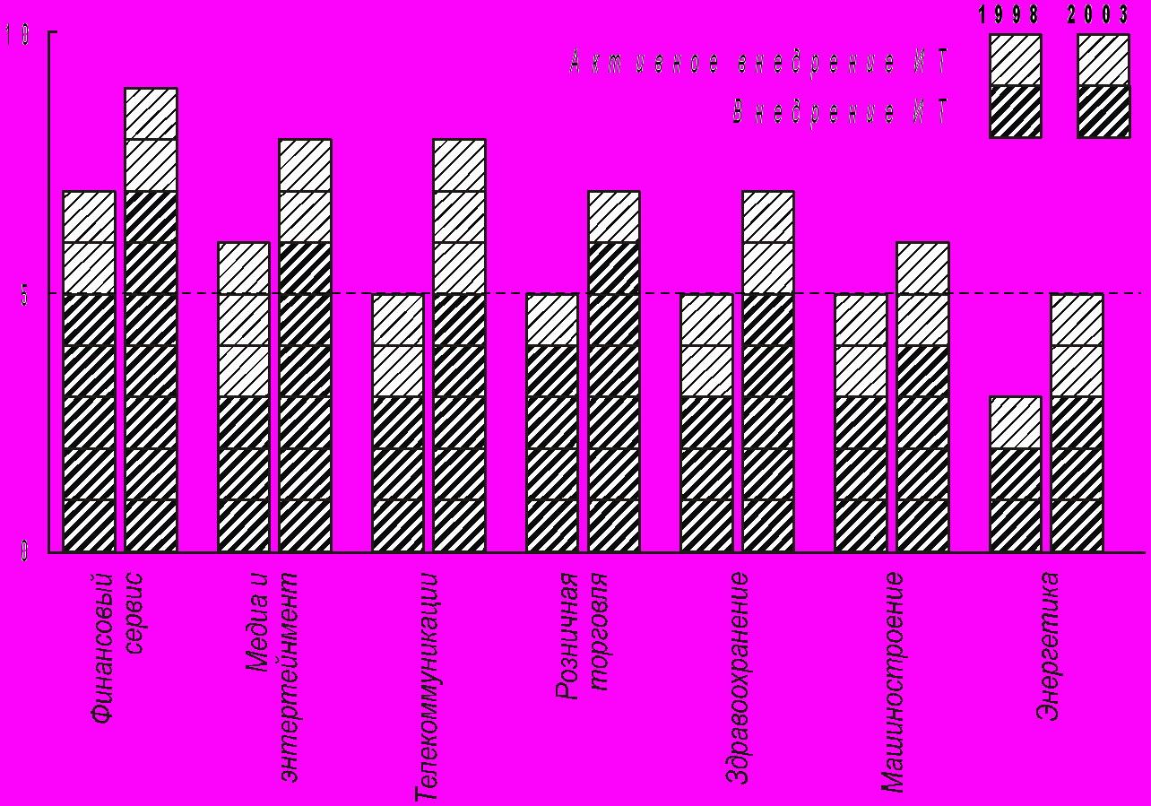 Степень компьютеризации в различных секторах рынка не одинакова — по прогнозам Gartner Group, компьютеризация разных отраслей экономики будет происходить, как показано на рис. 3 (наибольшие темпы роста будут наблюдаться в области телекоммуникаций).