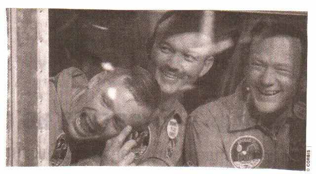 Как астронавты одеваются перед стартом, как их осматривают, как они идут, как их поднимают на корабль, как стартуют, как они любуются из космоса видом Канарских островов, как переодеваются, как едят, как бреются электробритвой, как перебрасываются предметами, подвешенными в невесомости, как спят, снова как едят, снова как бреются, правда, теперь уже безопасной бритвой. Как слушают музыку аудиоплейера, какая это музыка, что сказали музыканты, когда ее записывали и т.д. и т.п. Поскольку спешить некуда, то показывают, как астронавты в шутку снимают видеофильм о себе, как рисуют к нему заставки, эти заставки (4 или 5), разумеется, обязательно показываются зрителям. Как астронавты ведут из космоса шуточный телерепортаж о новостях спорта, передаются счета в матчах баскетбольной лиги. И т.д. и т.п. Причем все это с искрометным американским юмором. Например, весело шутят, показывая, как астронавты оправляются (подробно объясняется, что пакеты с экскрементами надо плотно закрывать крышками, а не то экскременты облепят всю кабину). Когда один идет оправляться, остальные, корча рожи, надевают кислородные маски, давая зрителям понять, что сильно воняет. Смешно. В общем, в бездне космоса бездна юмора. Американского.