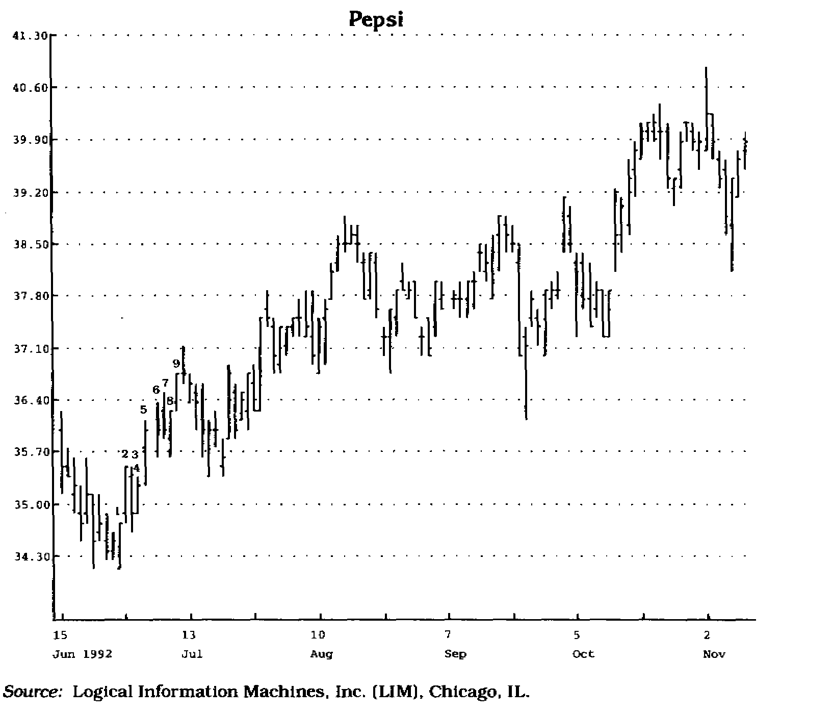 В динамике цен существует естественный ритм, определяемый сериями установочных наборов из девяти последовательных цен закрытия, каждая из которых больше или меньше цены закрытия четыре дня тому назад. Обычно в этот период рынок либо меняет направление, либо стабилизируется. В действительности же, как упоминалось ранее, последняя точка установочного набора часто является переломной в движении цен. Эти закономерности универсальны, в том смысле, что действуют на любом рынке и справедливы для любого временного интервала.