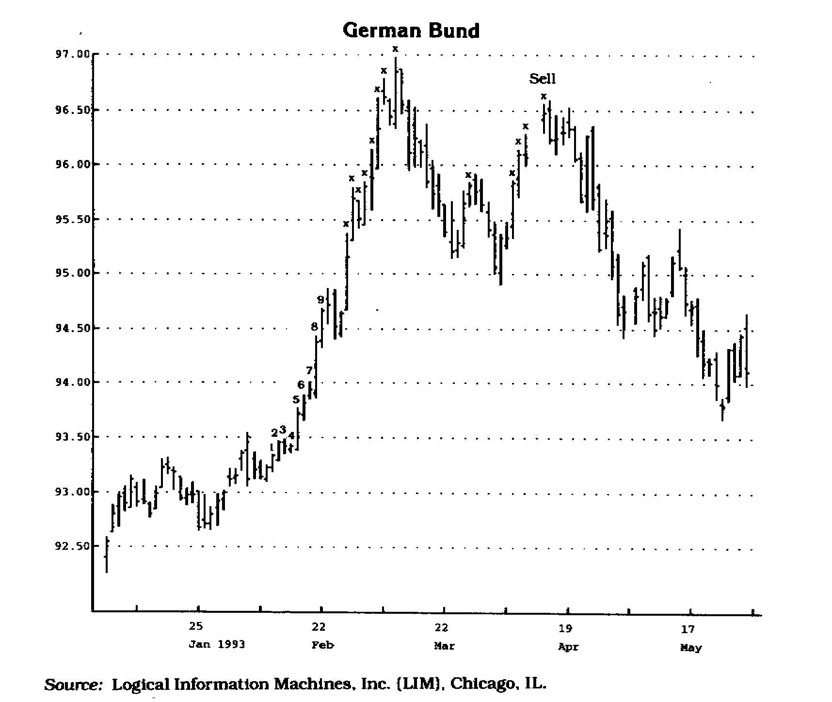 Рис.7.41 Сигнал к выходу из рынка возникает, если регистрируется девять последовательных цен закрытия, превышающих цену закрытия четыре дня тому назад, реализована прибыль и цена не преодолела уровень установочного набора в другом направлении, благодаря которому, собственно, и был осуществлен вход в рынок.