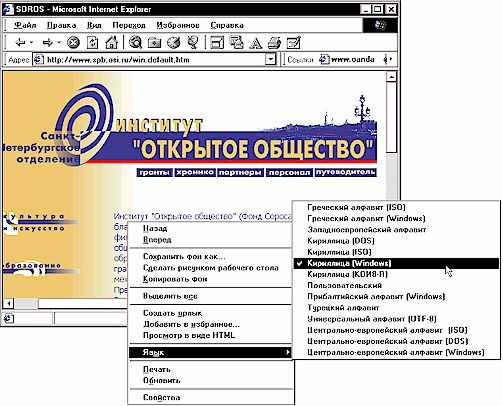 тобы изменить кодировку русскоязычной страницы Web в броузере Internet Explorer 4, выберите пункт Шрифты (Fonts) в меню Вид (View), а в Netscape Navigator 4 – пункт Encoding в меню View. Перед вами откроется список возможных кодировок, в котором вам нужно лишь выбрать нужную. Еще один способ – нажать на кнопку с буквой А на панели инструментов и в открывшемся меню выбрать нужную кодировку.