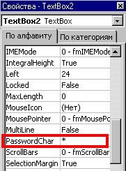 Свойство MaxLength позволяет ограничить количество символов, которые будут введены. Если пользователь попробует ввести больше, то будет звуковой сигнал. PasswordChar не дает возможности просматривать вводимые символы заменяя их на звездочки (*). Это полезно, как видно из имени, при вводе пароля. Свойство Locked определяет может ли пользователь редактировать поле. Посмотрите пример: