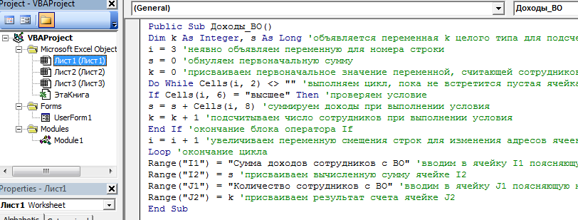 Таким образом, при нажатии этой кнопки на панели инструментов будет выполняться программа, подсчитывающая число сотрудников с высшим образованием и суммирующая их годовой доход.