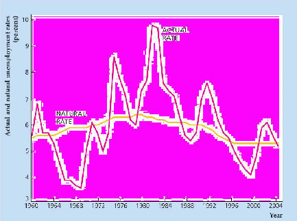 - Фактический и естественный уровни безработицы в США в 1960-2004 году