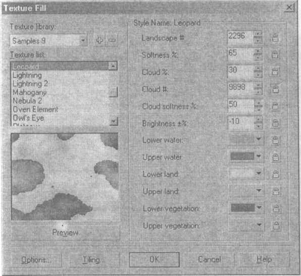 Кнопка «Options» позволяет изменить такие опции, как разрешение и максимальный размер битового (растрового) изображения. Кнопка «Tiling» позволяет назначить текстуре такие же свойства, как и заливке узором, т.е. позволяет использовать текстуру как узор.
