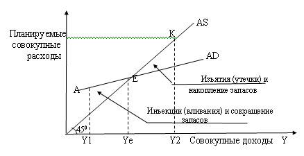 Если изъятия (сбережения) превышают инъекции (инвестиции), то совокупное предложение больше совокупного спроса (АS > АD), и в этом случае объем производства будет больше равновесного (Y2 > Ye), а следовательно, возрастают товарные запасы (точка К). Результатом будет сокращение объема производства, уменьшение уровня занятости и рост безработицы. Это приведет к снижению национального дохода, сокращению сбережений и экономика вернется в состояние равновесия (точка Е), которое наступает при неполной занятости экономических ресурсов.