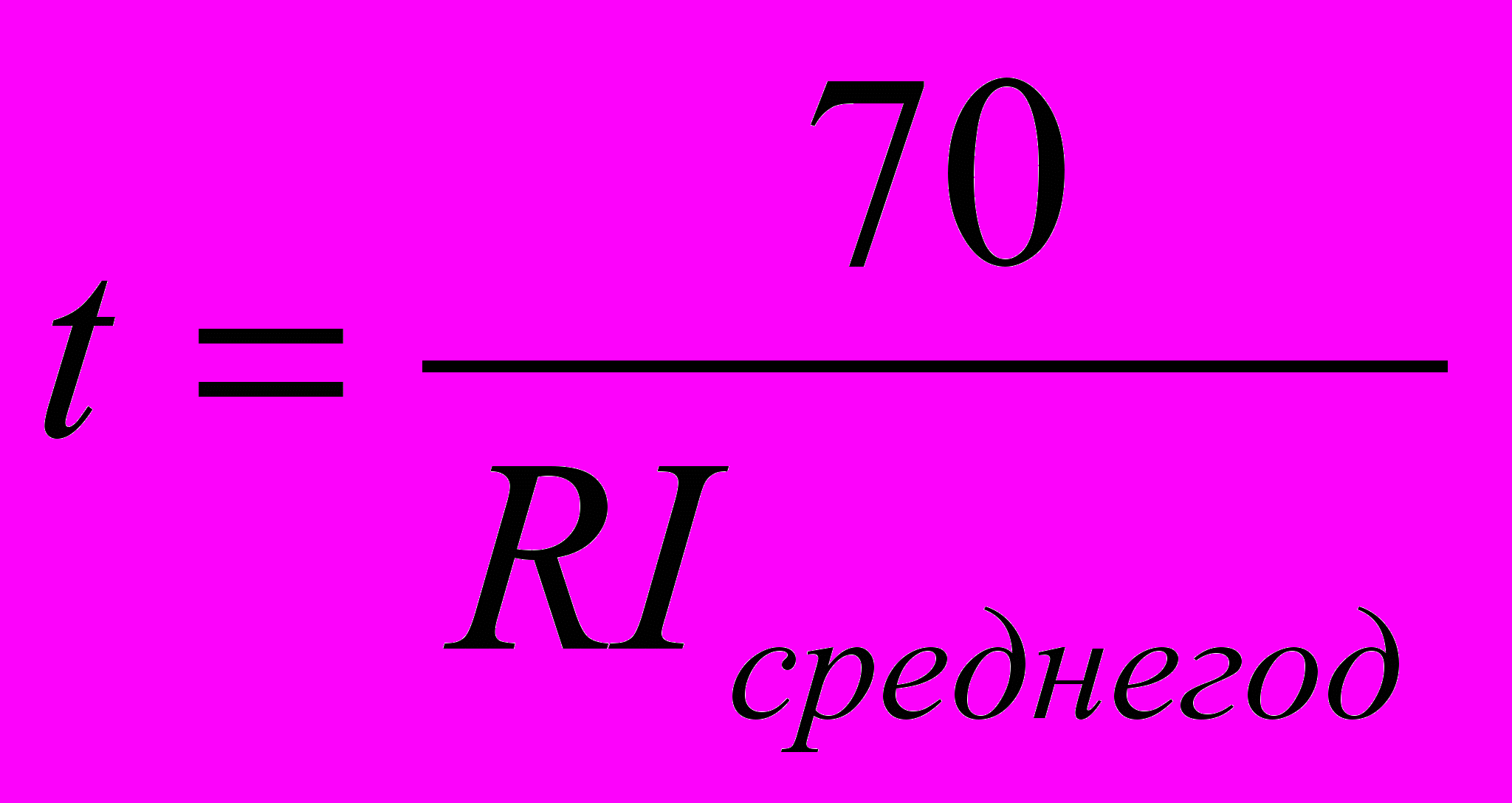 5. Правило величины 70. Этот показатель определяет количество лет t, необходимых для удвоения уровня цен. Обычно он используется в условиях умеренной инфляции, а точнее когда среднегодовая инфляция не превышает 30% (в данном случае RI измеряется в процентах):