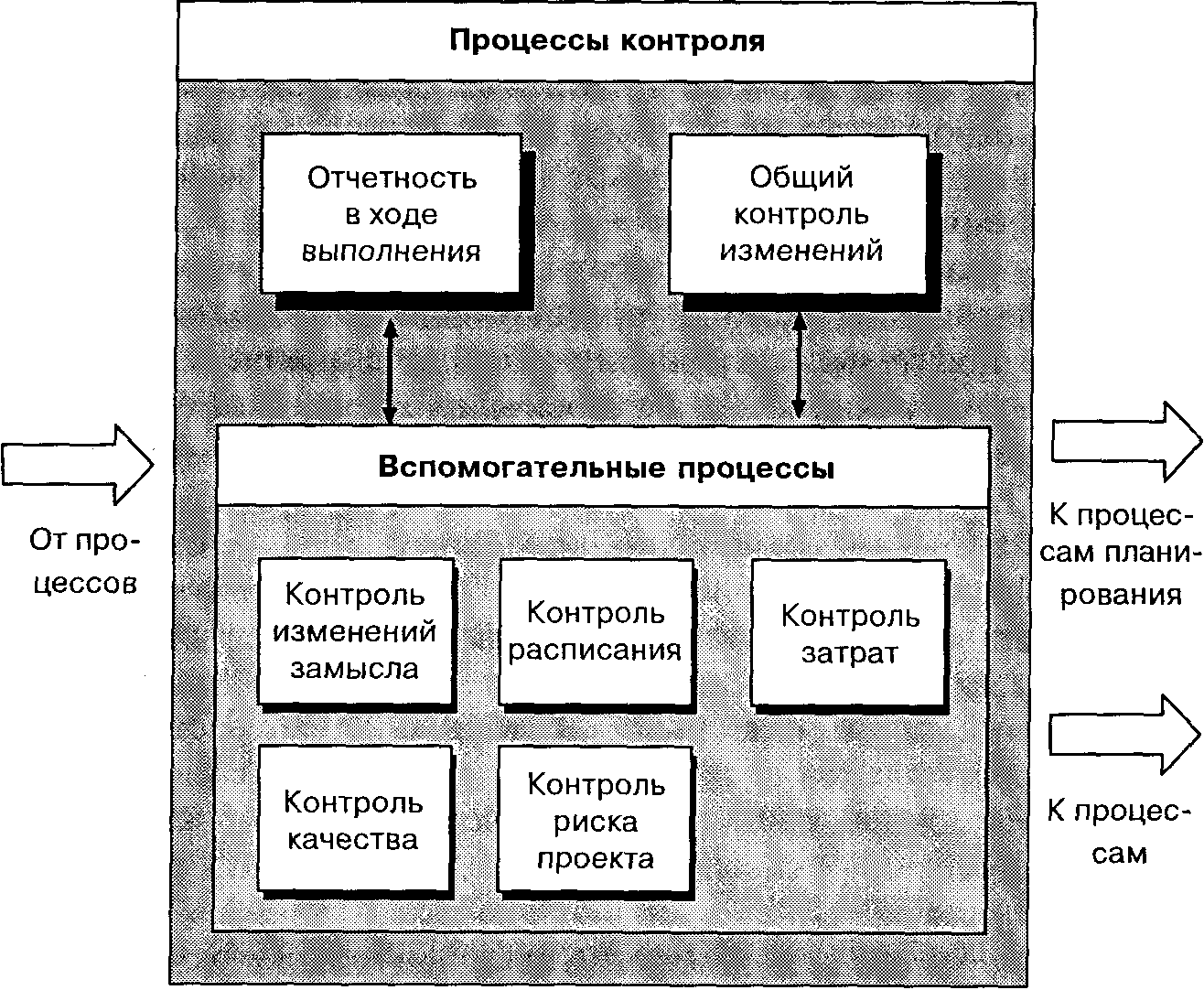 Обычно при управлении проектом контролируются три основные количественные характеристики – время, объем работ и стоимость. Процессы контроля проекта подразделяются на основные и вспомогательные (рис. 9.3):