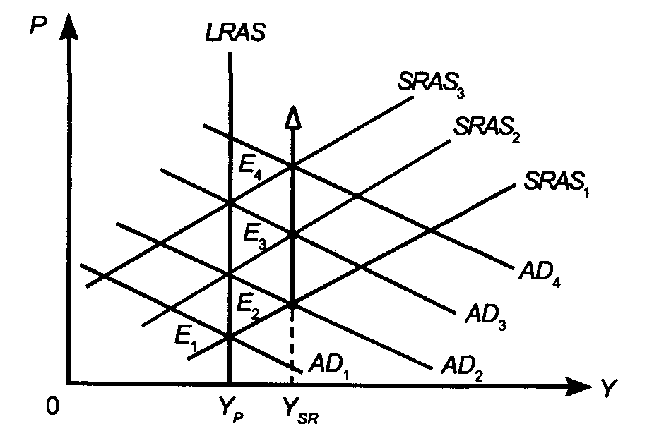 Первая — увеличение автономных расходов какой-либо части совокупных расходов. Вторая — увеличение Sm, передающееся через трансмиссионный механизм на изменение в совокупном спросе. В случае, если денежная политика остается неизменной, после сдвига вправо кривой AD рост зарплаты и других факторных затрат приведет к сдвигу влево кривой SRAS вдоль новой кривой AD. В результате долгосрочное равновесие восстановится, но на более высоком ценовом уровне. Инфляционный разрыв исчезнет, а совокупная продукция вернется к уровню потенциала. «Двухшаговый» инфляционный рост остановится лишь в точке нового долгосрочного равновесия.