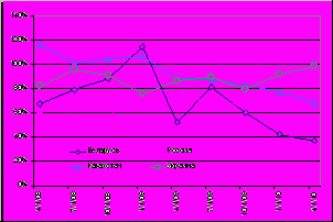 Валютный рынок остается во власти динамики внешних цен на сырье, обеспечивающее приток валюты от экспорта. В этих условиях динамика курсов валют основных стран СНГ становится все больше похожей на динамику курса других товарных валют, в частности канадского доллара (см. Рисунок 44).