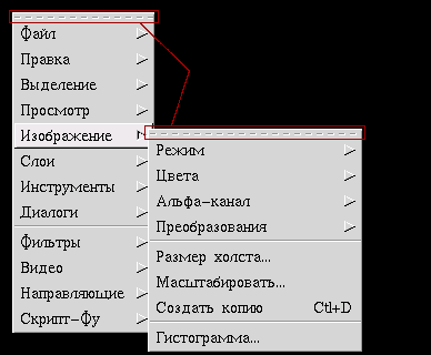 Отметим полезную возможность GIMP, которая призвана облегчить работу по вызову функций контекстного меню. Если вам часто приходится пользоваться одним из его пунктов, то постоянно выбирать его, перемещаясь по всему меню, довольно утомительно. Каждый пункт меню в верхней своей части содержит пунктирную полоску. Если к ней подвести курсор мыши, то эта полоска выделяется как отдельный элемент. Щелкните мышкой по пунктиру, и пункт меню превратится в самостоятельное окно.