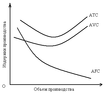 В краткосрочном периоде средние общие издержки равны сумме средних постоянных издержек. Но в отличие от общих издержек средние общие издержки не увеличиваются нарастающими темпами по мере увеличения количества производимой продукции, а сначала имеют тенденцию к снижению, лишь затем возрастают. Таким же образом веду себя и средние переменные издержки. А вот средние постоянные издержки непрерывно понижаются по мере роста объема производства в результате того, что данная сумма постоянных издержек распределяется на все большее и большее количество единиц продукции10. Наглядно особенности изменения средних издержек в зависимости от количества произведенной продукции в краткосрочном периоде можно показать на следующем графике (Рис. 5. Из книги Экономическая теория. Учебник. / Под ред. И.П.Николаевой. – М.: «Проспект», 2000. – с. 104).