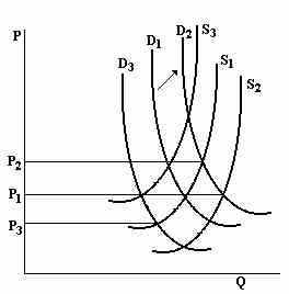 Теперь нарушим долговременное равновесие и предположим, что ценовые факторы изменили спрос на продукт с D1 до D2. Это благоприятное изменение спроса делает производство прибыльным. Новая установленная цена Р2 превышает валовые издержки. Экономические прибыли будут привлекать в отрасль новые фирмы, в результате чего предложение увеличится с S1 до S2. т.е. цена снова снизится до P1. Экономические прибыли, вызванные повышением спроса, сводятся конкуренцией к нулю. Долговременное равновесие восстановлено.
