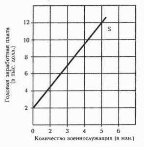 Здесь изображена кривая предложения военнослужащих-добровольцев (military volunteers). Довод, что люди не станут добровольно рисковать своей жизнью, опровергается тем фактом, что они делают это, причем не только военнослужащие-добровольцы, но и полицейские, монтажники-высотники (steeplejacks) и даже горнолыжники. Каковы бы ни были точное положение и наклон кривой, она будет обязательно подниматься вправо вверх. Некоторые люди (те, кто низко оценивает имеющиеся у них альтернативы) пойдут служить за очень низкое жалованье. Но при принятых здесь предпосылках три миллиона добровольцев можно найти не менее чем за 8000 долл. жалованья в год. Это означало бы ежегодную выплату в сумме 24 млрд. долл. Т. к. налогоплательщики не любят, когда повышаются их налоги, Конгресс не захочет санкционировать выделение таких громадных ассигнований. А представители министерства обороны очень чутко улавливают все, что нравится или не нравится Конгрессу. Они могут сократить эти удручающие расходы вдвое, предложив всего 4000 долл. и сделав воинскую службу обязательной. Публикуемые затраты составят теперь только 12 млрд. долл. И да здравствует экономия!