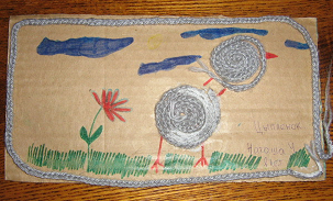 | Поделка из карандаша «Зайчик». Кошкин Женя, 6 лет. | Аппликация «Вязаный цыплёнок». Чкалова Наташа, 9 лет. |