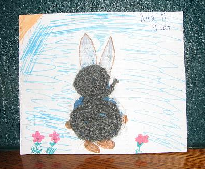 | Новогодняя открытка «Собачка». Пронина Вероника, 10 лет. | Поделка «Вязаный зайчик». Парутина Аня, 9 лет. |