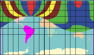Развертывание четверки спутников позволяет снизить угловую нестабильность КА практически в 2 раза. На рисунке 2 представлены зоны распределения угловых девиаций спутника относительно наземного наблюдателя в течение 6-и часового движения на апогейном участке орбиты "Кентавр". Цифрами обозначены максимальные угловые отклонения спутника от направления на наземного наблюдателя. Из рисунка видно, что на подавляющей территории обслуживания угловые девиации не превышают 5 град. При этом смещения подспутниковой точки составляет около 9 град по широте и 2 град по долготе.