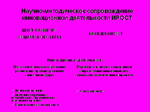 В условиях модернизации социальной сферы возрастает роль инновационной деятельности, которая приобретает все более массовый характер, так как возникает потребность существенного обновления содержания деятельности, социальных технологий, используемых в практике деятельности учреждений, достижения нового качества на основе инновационных инициатив по приоритетным направлениям образовательной деятельности. В связи с этим возрастает роль института в научно-методическом сопровождении инновационной деятельности социальной сферы региона.