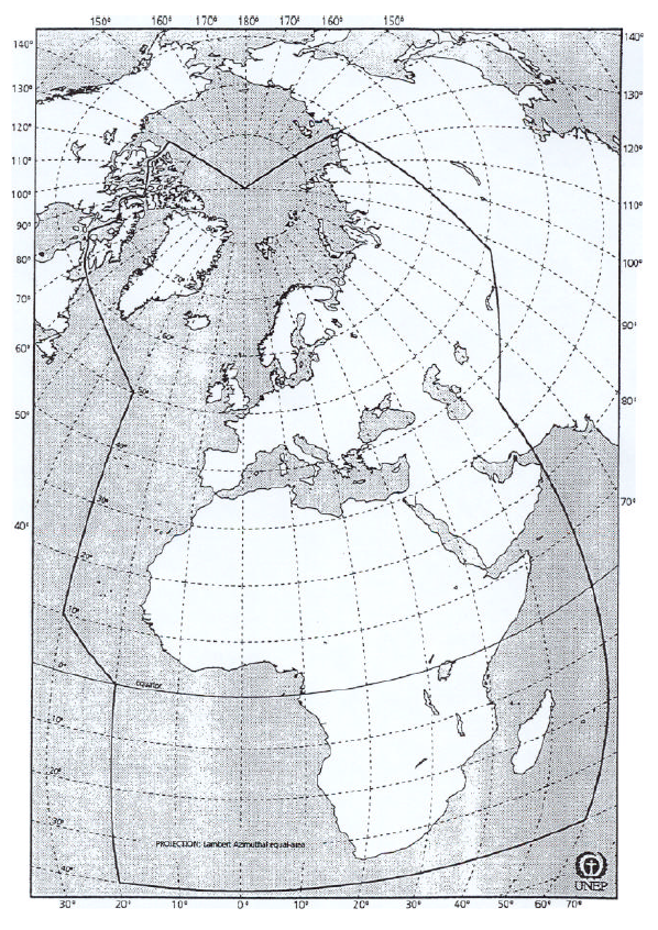 Границы Территории Соглашения определены следующим образом: от Северного Полюса по 1300 западному меридиану до 750 северной широты; далее на восток и юго-восток через пролив Мелвилла, Остров Принца Регента, залив Баффина, бассейн Фокса, канал Фокса и Гудзонов пролив к точке в северо-западной Атлантике с координатами 600с.ш. 600з.д.; далее к юго-востоку через северо-запад Атлантического океана до точки с координатами 500с.ш. 300з.д.; далее к югу по 300 меридиану западной долготы до 100с.ш.; далее к юго-востоку до Экватора на уровне 200 меридиана западной долготы; далее к югу вдоль 200 меридиана западной долготы до 400 параллели южной широты; далее на восток вдоль 400 параллели южной широты до 600 меридиана восточной долготы; далее на север по 600 меридиану восточной долготы до 300 параллели северной широты; далее на восток-северо-восток по большой окружности до точки на Западном Алтае с координатами 490с.ш. 87027'в.д.; далее на северо-восток по большой окружности до побережья Северного Ледовитого океана на уровне 1300 меридиана восточной долготы; далее к северу по 1300 меридиану восточной долготы до Северного Полюса. Границы Территории Соглашения показаны на нижеследующей карте.