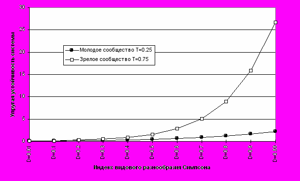 В этой связи нужно отметить, что указания на “достаточную устойчивость” систем с низким видовым разнообразием (Федоров, Гильманов, 1980 и др.) на самом деле свидетельствуют лишь об их стабильности во времени при условии отсутствия мощных возмущающих факторов извне, упругая же устойчивость таких систем невысока и может поддерживаться только при поступлении большого количества дополнительного вещества и энергии в систему, снижающего ее энтропию (агроценозы, лесные плантации и т.д.). Высокая же экологическая пластичность компонентов и лабильность связей простых систем при воздействии фактора, являясь адаптивными свойствами этих систем, приводят к установлению нового стационарного состояния, а фактически - к их трансформации, и не могут отождествляться с упругой устойчивостью экосистем.