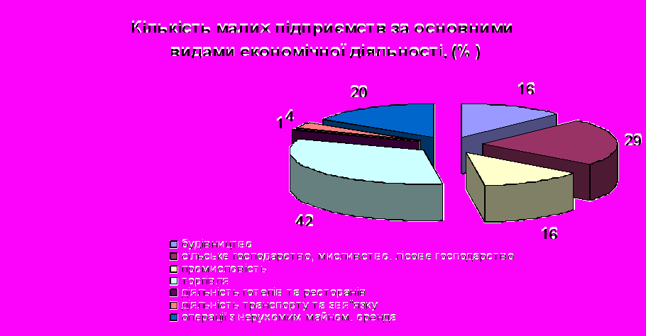 У розрізі видів економічної діяльності мале підприємництво віддає перевагу торгівельному бізнесу, яким займаються 42 % від загальної кількості малих підприємств. У виробничій сфері цифри скромніші, промислову діяльність здійснюють лише 16 %.