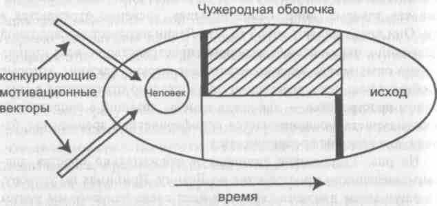 позволяющую ему передумать — то есть, легко сменить альтернативы на ходу). Чужеродная оболочка включает в себя все те факторы, которые будут влиять на прохождение, но которые человек не осознает, либо они только косвенно отражаются в его опыте. Здесь мы имеем неожиданные землетрясения, шальные пули, недооцененные факторы социального статуса и значения, неизвестные мнения других людей о нас, неправильно воспринимаемые социальные практики и обычаи, которые будут определять наш опыт по мере его развертывания в той же или большей степени, что и наши интерпретации.