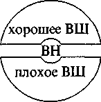 6.3. Однако, помимо приписывания существам, расположенным по другую сторону границы (богам, лесным животным, птицам, покойникам, другим народам), хаотической организации (не-организации) или «такой же, как у нас», может существовать представление о том, что потустороннему миру свойственна своя особая организация. Представление это возникает в связи со следующими структурными особенностями картины мира: оппозиция «организация о дезорганизация» способна разграничить поту- и посюсторонние миры, но она не способна провести границу внутри первого. Однако в реальных текстах культуры широко представлена не только противопоставленность мира животных и мира мертвых (или богов), но и разграничение богов на добрых и злых или ему подобных. ВШ распадается на две обособленные зоны, каждая из которых резко и однозначно оценивается. Оценочность выражается в резкой пространственной ориентированности модели («верх» <--> «низ»; реже «правое» <--> «левое»). Возникает схема, представленная на рисунке 5, которая, очевидно, гомеоморфна схеме на рисунке 6.