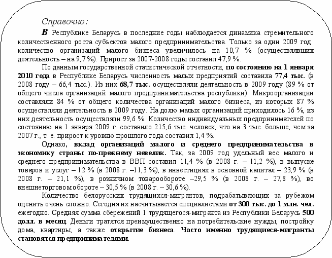 Интересно отметить, что вернувшийся в страну трудящийся-мигрант с солидной суммой денег может обратиться за консультацией по открытию собственного дела в центр поддержки предпринимательства. В Республике Беларусь действует сеть инфраструктуры поддержки и развития малого предпринимательства, включающая 43 центра поддержки предпринимательства и 7 инкубаторов малого предпринимательства.1 Их деятельность направлена на формирование благоприятных условий для создания и функционирования субъектов малого предпринимательства, активизацию предпринимательской деятельности.