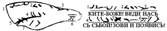 Каких только чудес на свете ни бывает! Мы, не сомневаясь ни на секунду в том, что перед нами портрет кашалота, все же усомнились в своих дешифровках, которые давали слишком хороший текст, чтобы в него можно было поверить. Поскольку рисунков рыбообразных чуринг было достаточно много, мы выбрали наугад еще одну, уже не дельфинообразную; но там тоже великолепно читался совершенно понятный текст.
