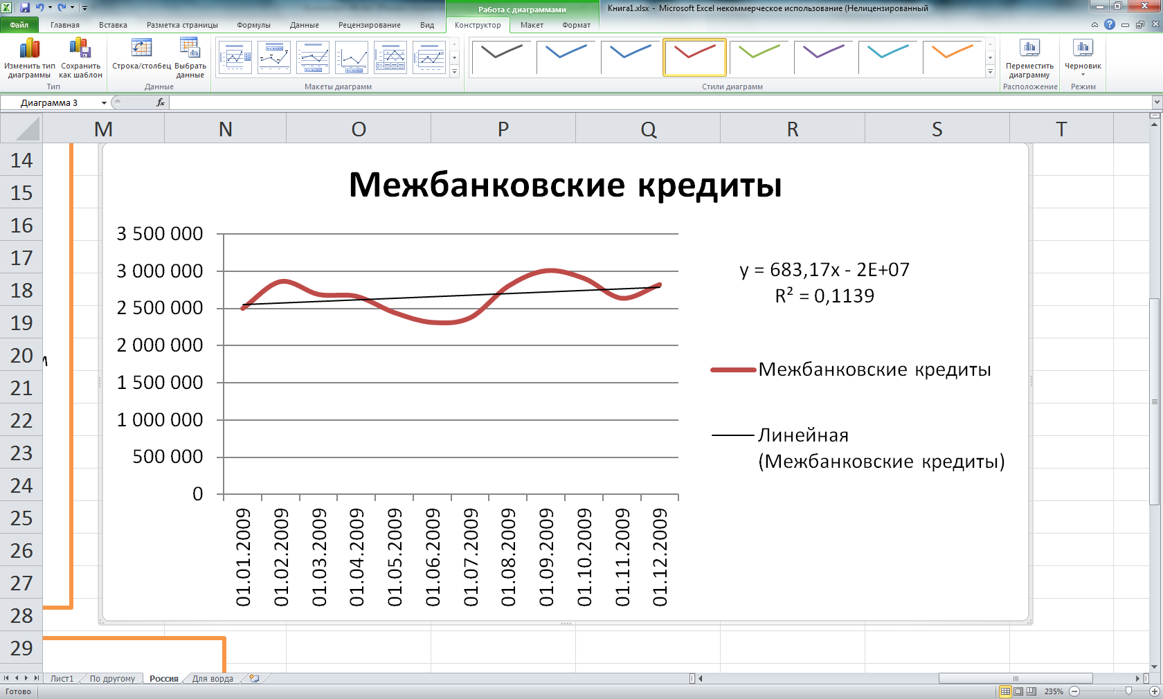 Для нас для дальнейшего анализа будут иметь значение параметры Ai и Aобщ (коэффициент рассчитанный на основе итогового значения всех параметров). На примере рис.1 и приведенного уравнения прямой линейного тренда мы видим, что коэффициент Ai для такого показателя как межбанковские кредиты в 2009 году будет равно 683,17.