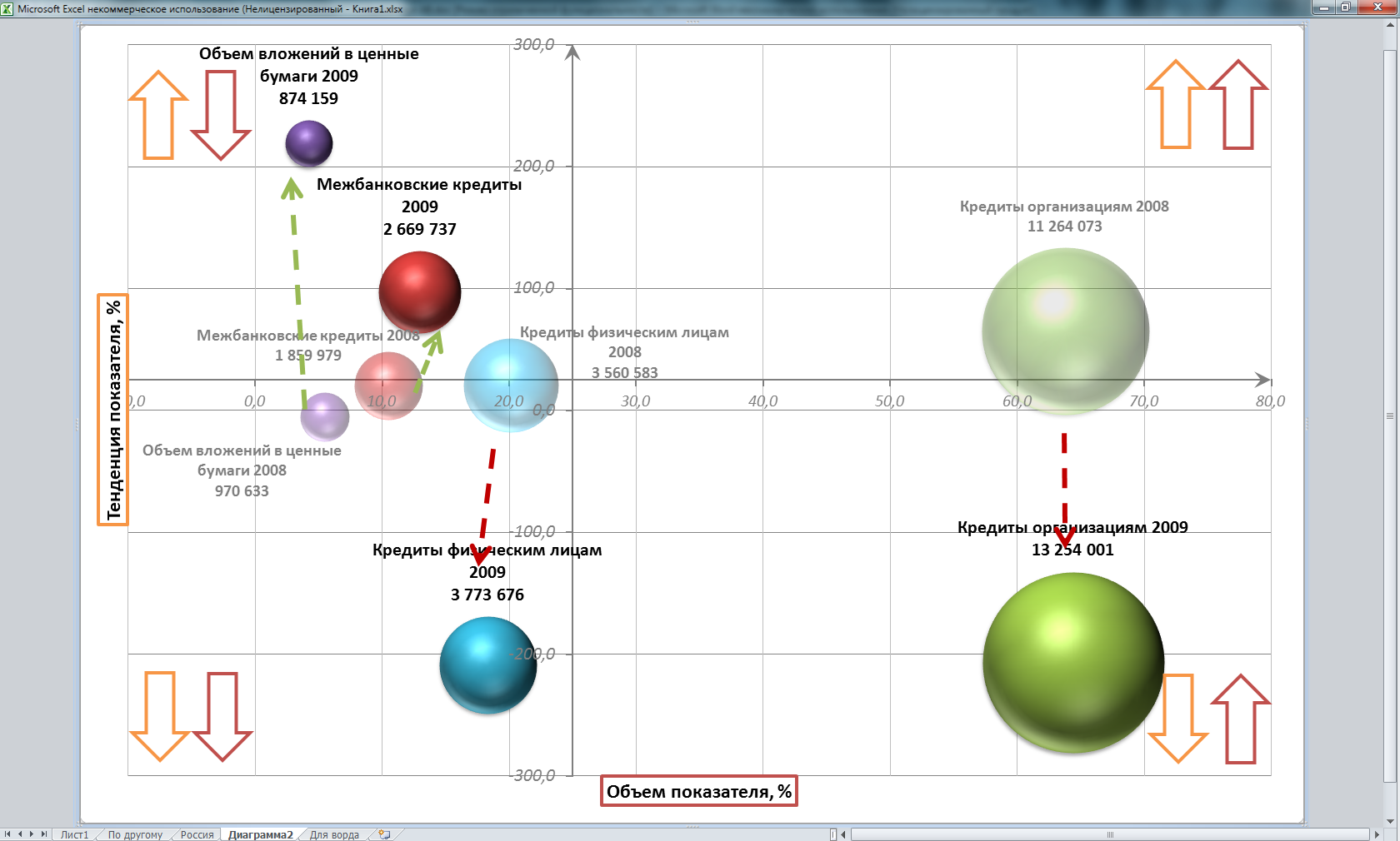 В качестве анализируемого взят период 2008-2009 гг. С помощью графической модели мы наглядно сможем увидеть структурные сдвиги, произошедшие в деятельности финансовых институтов во время финансово-экономического кризиса.