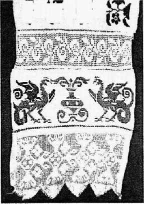 Для сравнения – между ними вышит человек, Похоже, что птицы, распустив хвосты и подняв крылья, сражаются между собой. А странный человек наблюдает за боем, На вышивке фактически изображены два гигантских страуса, но, как известно, в России подобные страусы водились только в Олигоцене 35 миллионов лет тому назад и в науке они называются Фаророкусами. Это были хищные бегающие птицы, достигающие в высоту пяти метров.
