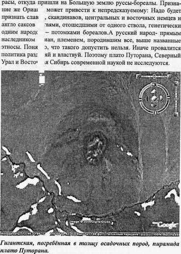 На северо-восточной оконечности плато Путорана со спутника хорошо видны странные параллельные дороги. Дороги удивительно ровные и идут они на этой части плато строго в меридиональном направлении только на север. Ближе к восточной части плато спутник зафиксировал дороги, идущие на запад и на северо-запад. Наши учёные стараются эти дороги не видеть. Как и многое другое. Например, гигантские, погребённые в толщу осадочных пород, самые древние на Земле пирамиды и развалины загадочных городов Путорана. Тут всё ясно и понятно! И дороги, и пирамиды, и останки давно забытых городов - не что иное, как наследие, некогда могущественной соперницы Атлантнды – Великой Орианы. Той прародины белой расы, откуда пришли на Большую землю руссы-бореалы. Признание же Орианы может привести к непредсказуемому: надо будет признать славян, скандинавов, центральных и восточных немцев и англо-саксов ветвями, отошедшими от одного ствола, генетически одним народом – потомками бореалов. А русский народ – прямым наследником ориан, племенем, породившим все выше названные этносы. Понятно, что такого допустить нельзя. Иначе провалится политика «разделяй и властвуй». Поэтому плато Путорана, Северный Урал и Восточная Сибирь современной наукой не исследуются.
