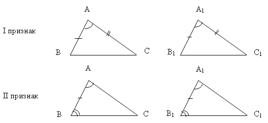 - Если две стороны и угол между ними одного треугольника соответственно равны двум сторонам и углу между ними другого треугольника, то треугольники равны. (И)