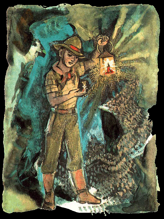 Свернув ковёр в трубку, он взял его под мышку. Королева-мышь, высунувшись из-за пазухи Тима, тоненьким голоском указывала ему направление, и скоро мальчик очутился около входа в подземный коридор. Здесь он зажёг фонарик, предусмотрительно данный ему Фарамантом, и двинулся вниз по крутому склону.