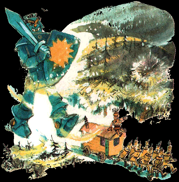 Ковёр быстро доставил мальчика к фургону, который уже оставил позади Большую реку и тоже углублялся в южную область. За ним неуклонно шагал Тилли-Вилли; дуболомы заводили его дважды в день.