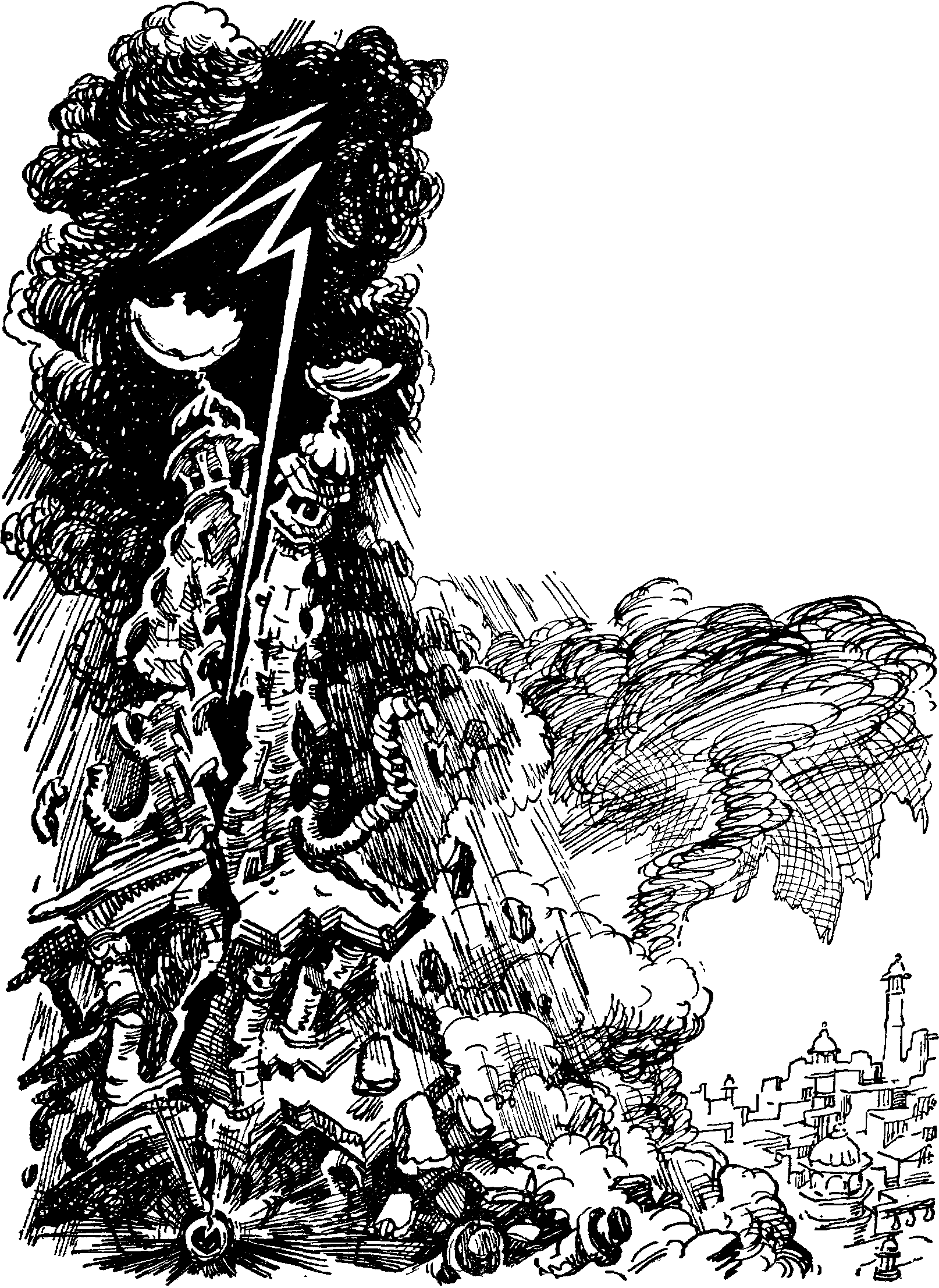 Юсуф взял его из рук старика и что было силы ударил по зелёному камню. Раздался оглушительный раскат грома, засверкали молнии, и при свете молний друзья увидели, как стены башни раскололись сверху донизу и зашатались.