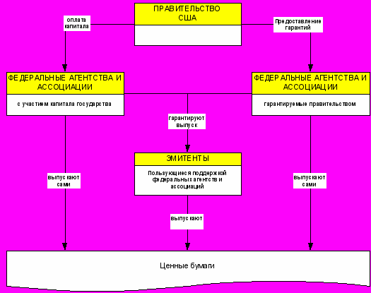 Правительство США участвует капиталом в агентствах и ассоциациях, имеющих цель страхования инвестиций и выдаче гарантий по долговым ценным бумагам, или предоставляет государственные гарантии по долговым ценным бумагам, выпущенным данными агентствами и ассоциациями. Агентства и ассоциации выпускают и продают ценные бумаги, значительная часть которых обеспеченны ABS. Агентства и ассоциации гарантируют выпуск долговых ценных бумаг иных эмитентов. Иные эмитенты выпускают и продают ценные бумаги конечным инвесторам. Таким образом, в системе государственной поддержке общественно-значимых проектов, основанной на федеральных агентствах и ассоциациях, реализованы три концептуальных механизма государственной поддержки: