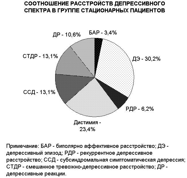Современные подходы в клинической эпидемиологии постулируют, что изучение распространенности, особенностей клинических проявлений и течения тех или иных заболеваний в дифференцированных популяциях больных дают возможность клиницисту более ясно представлять, с какой частотой он будет встречаться с конкретным заболеванием на разных уровнях оказания помощи в системе общественного здравоохранения. Второй ключевой момент клинической эпидемиологии заключается в том, что доказательно изученные выборки пациентов с определенными клиническими особенностями проявлений болезни в типичных ситуациях и в дифференцированных популяциях больных дают возможность более четко распознавать заболевание, оценивать его клинические особенности, течение, прогноз и применять адекватную терапию [13]. Распространенность депрессии в соматических стационарах и различается, прежде всего, в зависимости от тяжести и особенностей соматических заболеваний, составляя по данным различных наблюдений от 18 до 33% [1,3,5,7,10,18,21,22,28].
