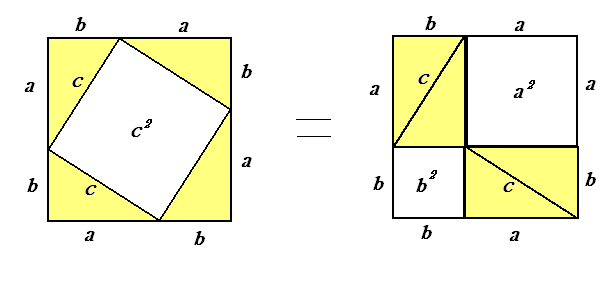 На древнекитайском чертеже четыре равных прямоугольных треугольника с катетами a, b и гипотенузой с уложены так, что их внешний контур образует квадрат со стороной a+b, а внутренний – квадрат со стороной с, построенный на гипотенузе