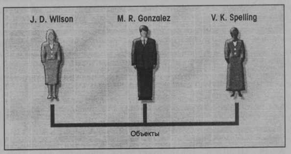 Важнейшей характеристикой объекта является его уникальная идентификация. Чтобы особо подчеркнуть этот факт, рассмотрим объект реального мира, представленный | на рис. 11.1. Обратите внимание, что студент (объект) с именем J. D. Wilson имеет уникальную (биологическую) идентификацию и этим отличается от объектов М. R. Gonzalez или V. К. Spelling. Также отметим, что хотя объекты имеют общие основные свойства, например, имя, номер социального страхования, адрес и дату рождения, тем не менее, каждый объект существует во времени и пространстве независимо от других объектов.