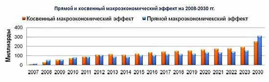 | Совокупный макроэкономический эффект в ценах 2007 г. | 1 500 млрд. руб. | 2 311 млрд. руб. | 7 012 млрд. руб. |