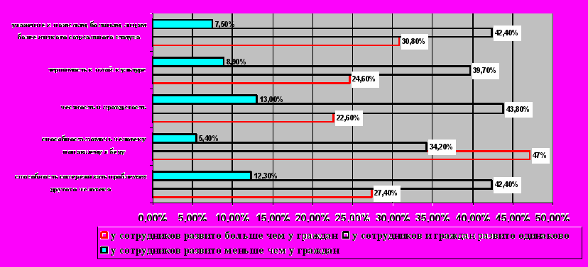 Те человеческие качества, которые сотрудники милиции считают у себя более развитыми, чем граждане, сами граждане считают у сотрудников милиции менее развитыми и наоборот. Этот факт, учитывая, что более 50% опрошенных видят существенные различия в человеческих качествах граждан и сотрудников милиции, говорит о том, что в общественном мнении о сотрудниках милиции и в общественном мнении самих сотрудников милиции сложился глубокий диссонанс: оставаясь частью народа, сотрудники милиции представляются его представителям особенной общностью по человеческим качествам. Эта особенность в том, что исследуемые важнейшие человеческие качества сотрудников милиции, с точки зрения граждан, присущи милиционерам в меньшей или равной степени, чем остальным гражданам. Сотрудники милиции, с другой стороны, те же исследованные качества оценивают у себя так же или более развитыми, чем у граждан. Налицо определенное ценностное противопоставление исследованной общности гражданских лиц (а это в подавляющем большинстве – студены, молодые люди в возрасте от 16 до 25 лет) и социально-профессиональной общности сотрудников милиции. Диаграмма №5 Как Вы оцениваете проявление важнейших гражданских качеств у сотрудников милиции в целом, как у представителей особой социально-профессиональной общности? (Милиционеры) Диаграмма №6Как Вы оцениваете проявление важнейших гражданских качеств сотрудников милиции, с которыми Вам приходится иметь дело? (Граждане) ![]() Главный вывод сопоставления данных диаграмм: верность идеалам демократии не проявляется у сотрудников милиции по самооценке в 24,6% случаев и по оценке гражданских лиц в 22,2% случаев; проявляется постоянно по самооценке в 12% случаев и по оценке гражданских лиц в 6% случаев. «Ситуативная» верность идеалам демократии по самооценкам – в 39% случаев по самооценке и в 34% случаев по оценке граждан. Таким образом, обе группы респондентов сходятся в том, что верность идеалам демократии – гражданское свойство, не характерное для сотрудников милиции. Такой важнейший вывод подтверждается как оценками, так и самооценками: уважение к законам России как постоянное гражданское качество сотрудники милиции обозначают лишь в 45,9% случаев, при этом уважение к законам России не проявляется в 7,5% случаев. Эти цифры, соответственно, обратно пропорциональны тем, которые дает опрос граждан. Последние считают, что уважение к законам России у сотрудников милиции не проявляется уже в 16,6% случаев, а постоянно проявляется в 33,3% случаев. Особое место занимает чувство личной свободы: сотрудники милиции считают, что оно проявляется у них постоянно только в 21,2% случаев, в то время как граждане считают, что оно присуще как постоянное свойство сотрудникам милиции в 46,3% случаев. Очевидно, речь идет о том, что граждане под личной свободой сотрудника имеют в виду больший объем социальных (официальных и неофициальных) привилегий и прав по отношению к другим участникам социального взаимодействия. Сотрудники милиции под личной свободой (которую они представляют себе как относительно слабо развитое гражданское качество своей социально-профессиональной общности) имеют в виду, очевидно, возможность поступать в соответствии со своими убеждениями, идеалами, ценностями и диспозициями, которые, во многих случаях не совпадают с официальными