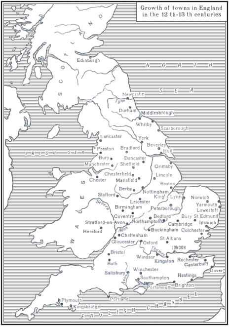 The growth of trade promoted the growth of towns. (See Map 9) London, the residence of the Norman kings, became the most populous town of England. Two centuries before, kings had realised that towns could become effective centres of royal authority and balance the power of the local nobility. As a result, many towns got ‘charters of freedom’ which freed them from feudal duties to the local lord. These charters, however, had to be paid for, but they were worth the money. Towns could then raise their own taxes on coming goods. They could also have their own courts, controlled by the town merchants, on condition that they paid an annual tax to the king. People who lived inside the town walls were practically free from feudal rule. It was the beginning of a middle class and a capitalist economy.
