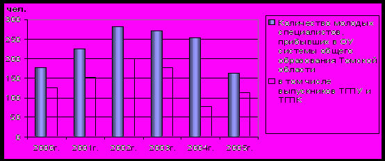В 2005 году в образовательные учреждения было распределено 288 выпускников Томского государственного педагогического университета, 98 выпускников Томского государственного педагогического колледжа, однако на 1 сентября 2005 года по месту распределения прибыло лишь 96 выпускников ТГПУ и 21 ТГПК (см. рис. 36.).