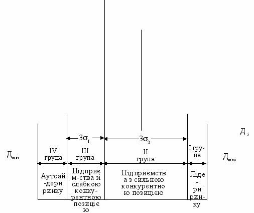 - із сильною конкурентною позицією (відповідно групи 3 і 2). Підприємства, що не потрапляють у дані інтервали, істотно відрізняються від даних груп із погляду статистичного розподілу. Вони формують окремі групи - аутсайдерів (група 4) і лідерів ринку (група 1), як це показано на рис. 2.5.Етапи визначення меж поданих груп: 1) Розраховується середнє арифметичне значення ринкових часток. 2) Вся сукупність підприємств аналізованого ринку ділиться на 2 сектори, для яких значення часток більше або менше середнього значення. 3) У кожному із секторів розраховуються середньоквадратичні відхилення, що разом із мінімальним і максимальним значеннями визначають межі поданих груп.