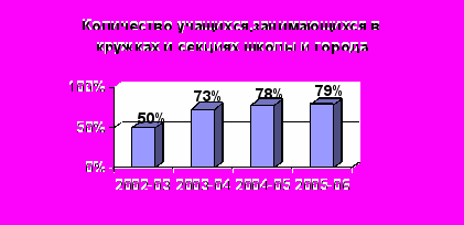 Кроме кружков и секций спортивной направленности, в школе работают: изостудия, студия спортивного бального танца, декоративно- прикладного творчества, шахматный клуб, кружок «Художественное слово», интеллектуальный клуб «Фортуна». Процент занятости учащихся ежегодно растет.